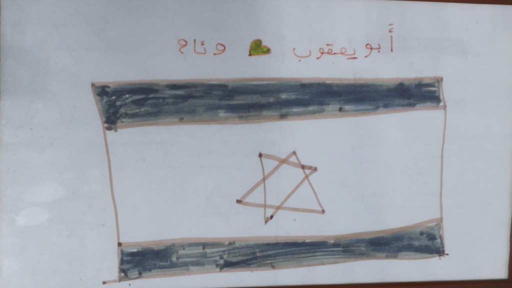A drawing of the Israeli flag by a Syrian child. It says: Wiam (Arabic girl’s name) [heart] Abu Yaacob (Eyal’s Arabic name)