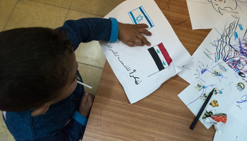 A child’s drawing of the Israeli and Syrian flags. Text reads: “Thank you for the people of Israel”