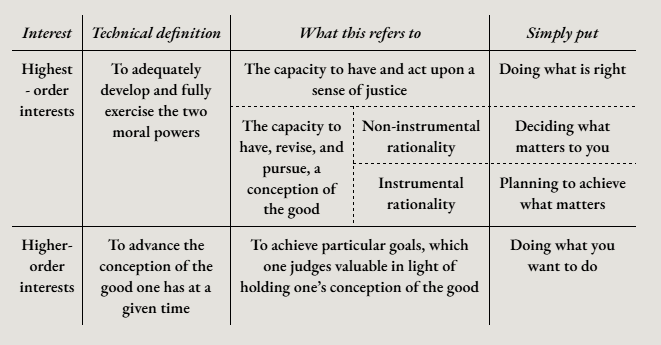 As shown, the distinction between highest-order and higher-order interests runs throughout Rawls’ work. But explicit use of this terminology can be found in: Rawls, J. (1982) Social Unity and Primary Goods, in Sen, A., and Williams, B., (Eds.) Utilitarianism and Beyond. Cambridge: Cambridge University Press, pp. 159–186. This essay (along with Rawls’ other articles) is reprinted as chapter 17 in: Rawls, J. (1999b). Collected Papers. (Freeman, S., Ed.). Cambridge: Harvard University Press.