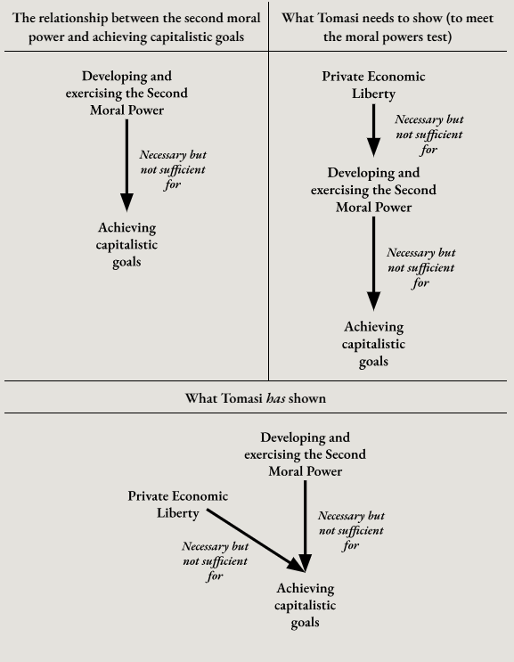 Now, consider again how Tomasi supports premise (2) – as discussed in §2.3. When discussing freedom of contract, freedom from taxation, and the freedoms to own and accumulate productive property, Tomasi argues that citizens are not able to be full self-authors if they cannot achieve certain goals which private economic liberty’s provision is essential to create the social and political conditions for – listing working longer hours, leaving bequests, and opening a small business or owning a conglomerate. But this means that Tomasi has not shown private economic liberty meets the burden of proof of the moral powers test: these enable citizens to achieve their mere higher-order interests. Shown graphically: