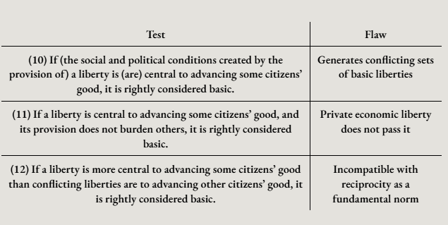 So, the charge-sheet against alternative tests for considering liberties basic which private economic liberty would pass include not only their ability to generate absurd and contradictory sets of basic liberties, but severe misunderstanding of the Rawlsian approach to distributing the means of achieving citizens’ particular goals. This shows, definitively, that Tomasi’s argument could not be rescued by appeal to an alternative test for considering liberties basic.