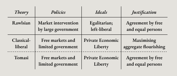 But private economic liberty’s provision does burden others. This point, however, is complicated by the “under favourable circumstances” proviso in Tomasi’s quote above. To explain: Rawls states that, for the purposes of deciding the justice of economic systems, we should ignore their feasibility and focus instead on whether they aim at justice – and assume they will succeed, for these evaluative purposes. In light of this, consider Samuel Freeman’s initial response to Tomasi. He argued that making laissez-faire freedom of contract basic burdens other workers by exposing them to risks of domination by allowing employers to demand employees work long hours. But consider: this can only happen when employers enjoy sufficient bargaining power over workers – otherwise, workers could simply refuse and walk out to work somewhere else (or not at all) – and Tomasi rightly states sufficiently high economic growth prevents this and notes free-market systems aim at such growth. Therefore, by the standards of Rawlsian institutional analysis – where economic systems are evaluated assuming they achieve their aims – Freeman’s objection fails. In short: it fails to acknowledge Tomasi’s thoroughly-Rawlsian “under favourable circumstances” proviso.